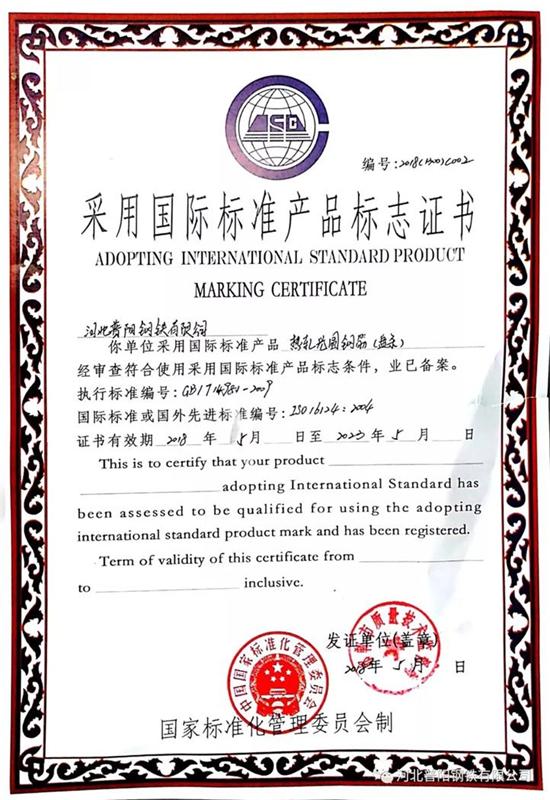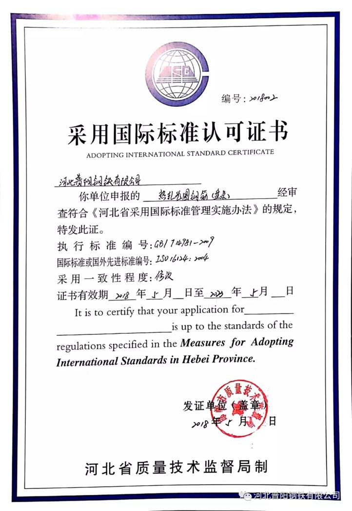 近日,經過國家標準化管理委員會、河北省質量技術監(jiān)督局的嚴格檢驗以及行業(yè)專家對產品實物質量與國外同類產品質量性能指標的比較評估,核定我公司生產的熱軋光圓鋼筋(盤條)指標完全符合國際標準要求,質量達到國際先進水平,國家標準化管理委員會、河北省質量技術監(jiān)督局特授予《采用國際標準產品標志證書》和《采用國際標準認可證書》。這標志著我公司的熱軋光圓鋼筋(盤條)順利通過“雙采”認證。
