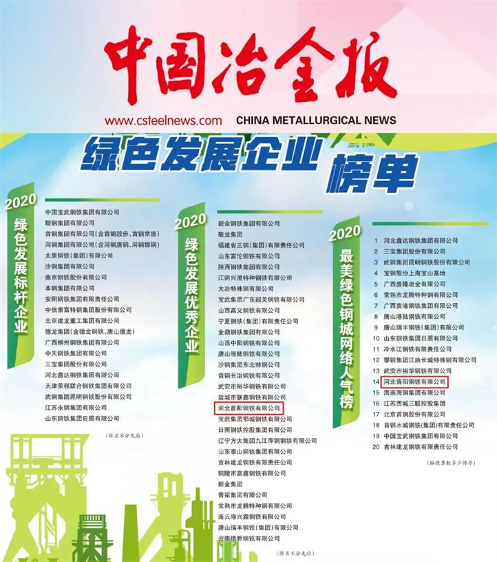 世界環(huán)境日,中國冶金報(bào)社發(fā)布綠色發(fā)展企業(yè)榜單。河北普陽鋼鐵有限公司憑借卓越的環(huán)保治理社會(huì)貢獻(xiàn)力和公眾認(rèn)可度,從參評(píng)的140家國內(nèi)知名鋼企中脫穎而出,榮獲“2020年度綠色發(fā)展優(yōu)秀企業(yè)”榮譽(yù)稱號(hào),入列“最美綠色鋼城網(wǎng)絡(luò)人氣榜”,這是普陽鋼鐵集團(tuán)去年以來連續(xù)兩次獲評(píng)“綠色發(fā)展優(yōu)秀企業(yè)”。