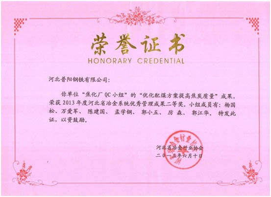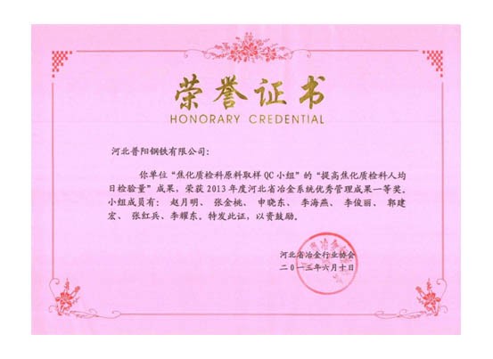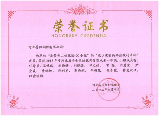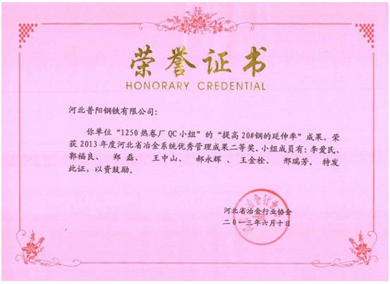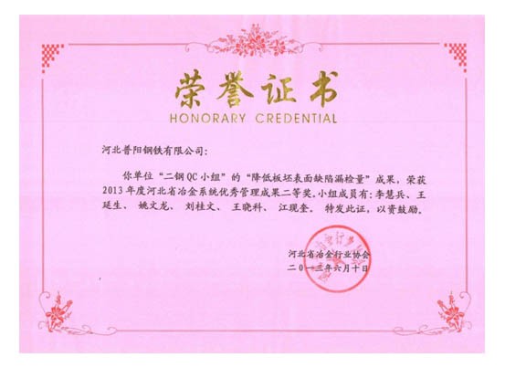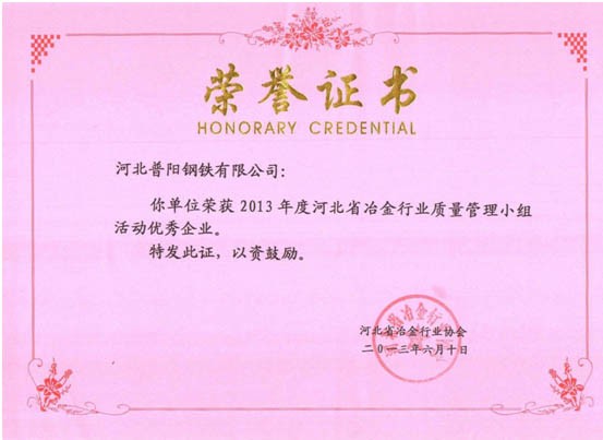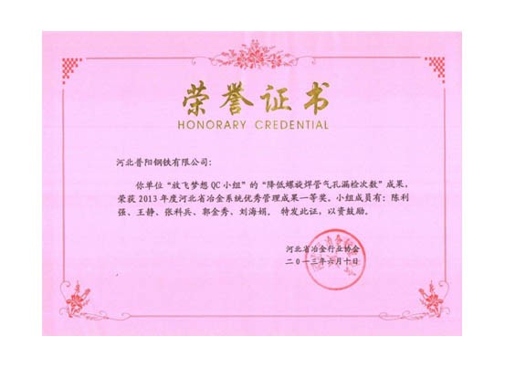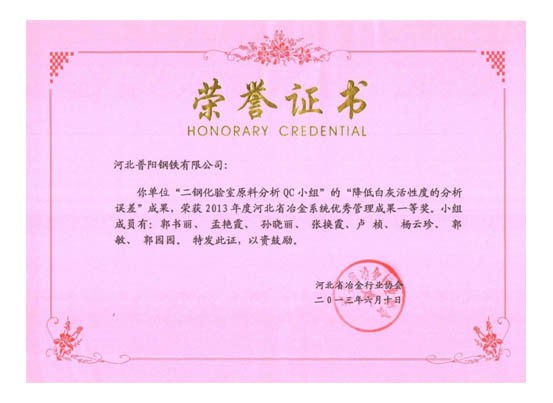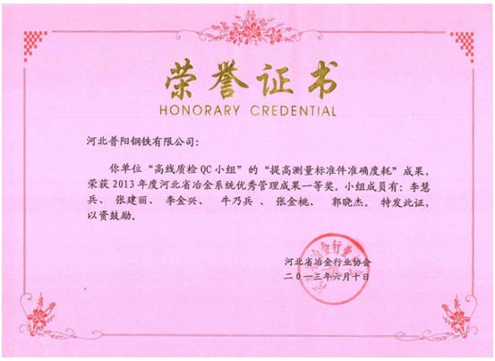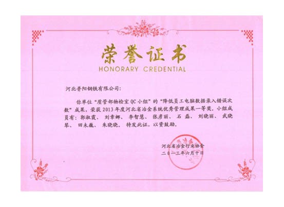 QC小組課題獲得了一等獎(jiǎng)8個(gè),二等獎(jiǎng)3個(gè)的好成績,同時(shí)公司榮獲“2013年度河北省冶金行業(yè)質(zhì)量管理小組活動(dòng)優(yōu)秀企業(yè)”的稱號。